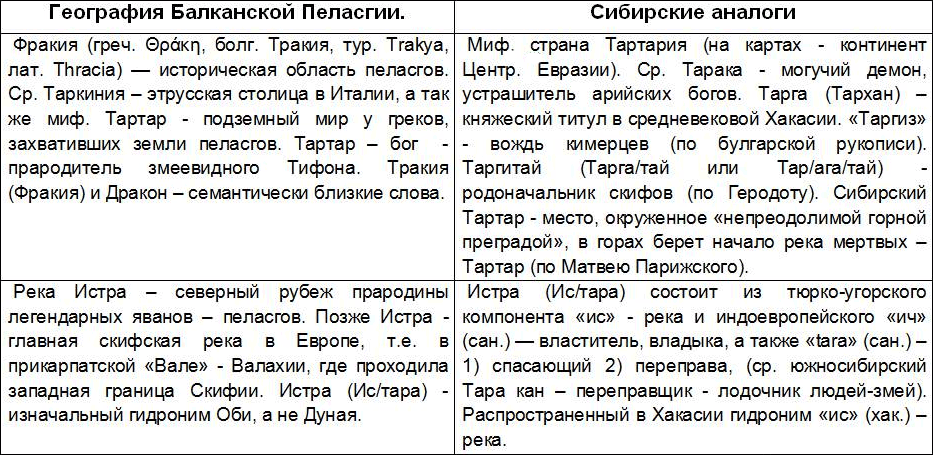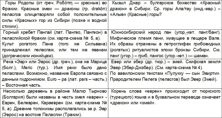 Сравнительная таблица между некоторыми топонимами Пеласгии на востоке Балкан и его южносибирскими аналогами.