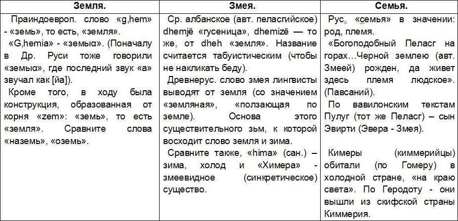 Сравнительный анализ пеласгийского словосочетания «Черная земля» (прародитель Пеласга) с древнеславянскими словами «земля», «змея» и «семья».