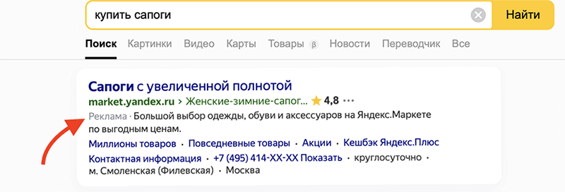 Поиск – поисковая реклама в Яндексе или Google. Если ввести запрос, то первые и последние 5 результатов на странице будут рекламными объявлениями. Это и есть поисковая реклама. Отличается высокой стоимостью клика (от нескольких десятков до нескольких тысяч рублей, в зависимости от ниши и места размещения).