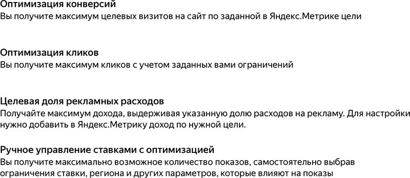 Стратегии – в Яндексе есть автоматические и ручные стратегии управления ставками. Они позволяют корректировать ставки в течение всего времени показа рекламных объявлений. Автоматическая стратегия хороша, когда есть большой бюджет и понимание, что ей нужно дать время (от недели до месяца) на обучение. Как правило, мы обещаем клиентам ручную стратегию, так как она более надежная и дает быстрый результат.