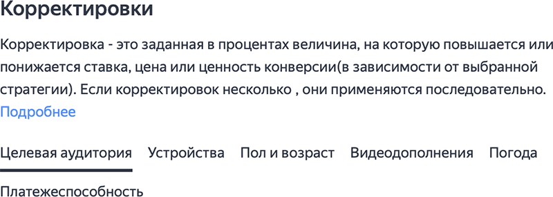Корректировки ставок – понижающий и/или повышающий коэффициент на определенную аудиторию пользователей. Например, по полу, возрасту, типу устройства. Также недавно появилась возможность настроить корректировки по платежеспособности и погоде.