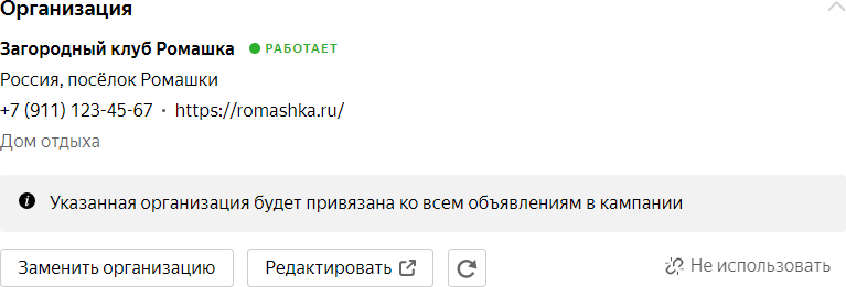 Карточка организации в Яндекс. Директ
