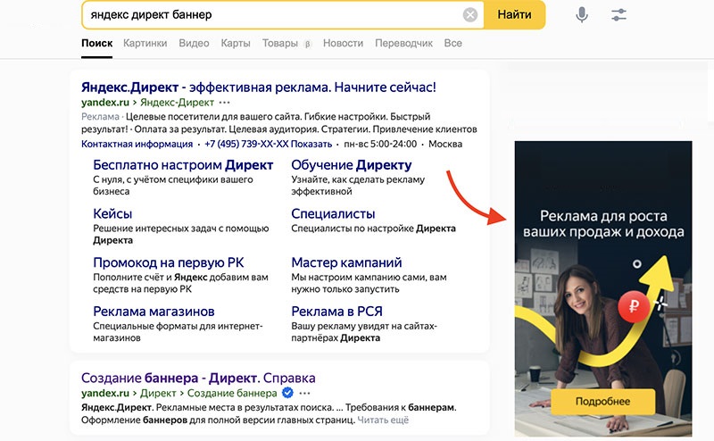Баннер на поиске – большой баннер, который показывается справа от текстовой поисковой выдачи. Стоимость клика аналогична стоимости клика по объявлению на первом месте в поиске. Спорный формат, хорош тем, что можно использовать графическое объявление на поиске.