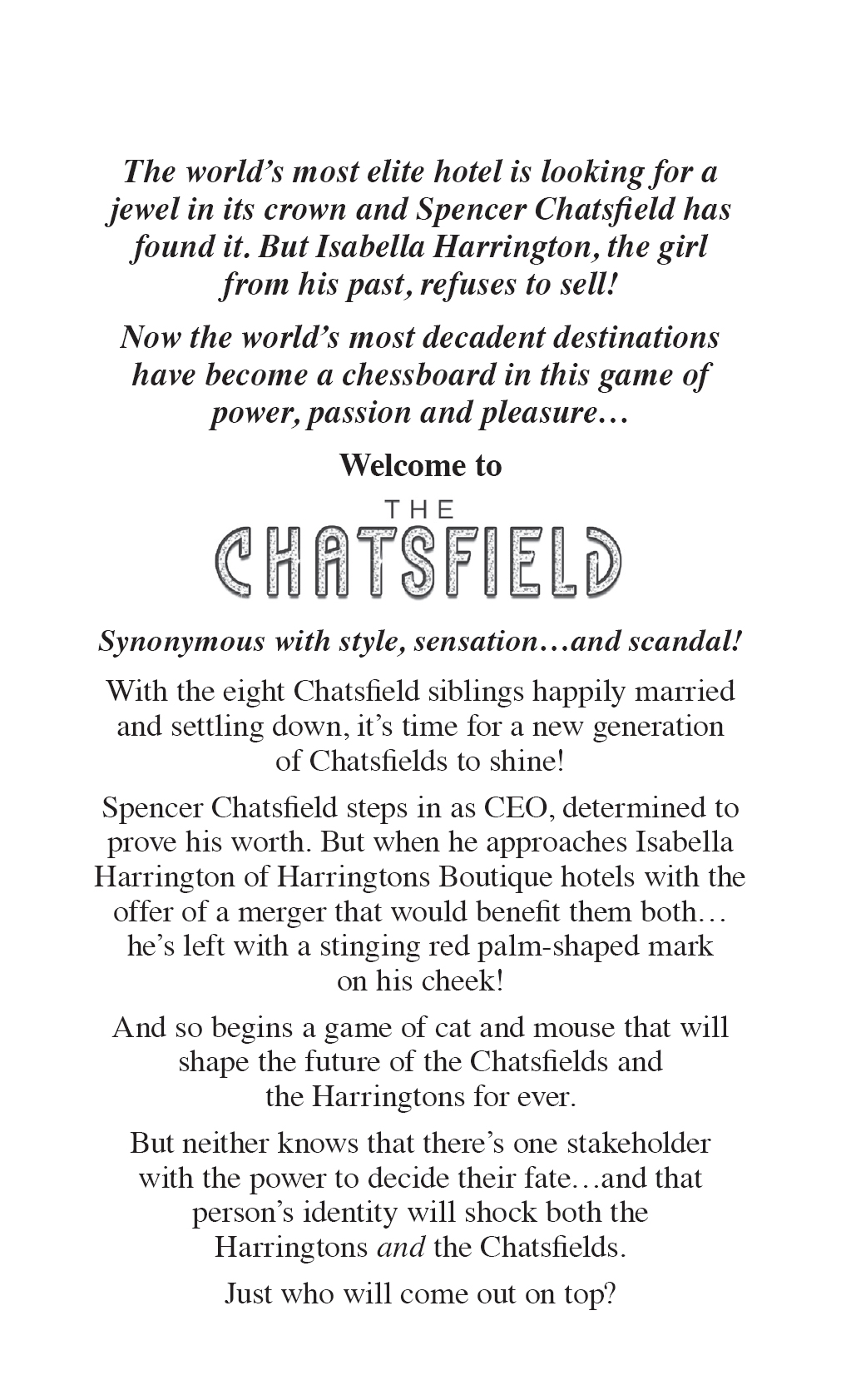Leila looked at an advert for a bar and saw pictures of cocktails in bright colours with tempting names. Even if she didn’t really know what it was, she blushed when she saw there was one called Screaming Orgasm, and there were other names too, but she liked the look of one called Manhattan. She read about restaurants where people met just to talk and eat. She read about two luxury hotels in the heart of New York. The Chatsfield caught her eye. It had branches around the world and it would seem that the most scandalous and famous people stayed there.