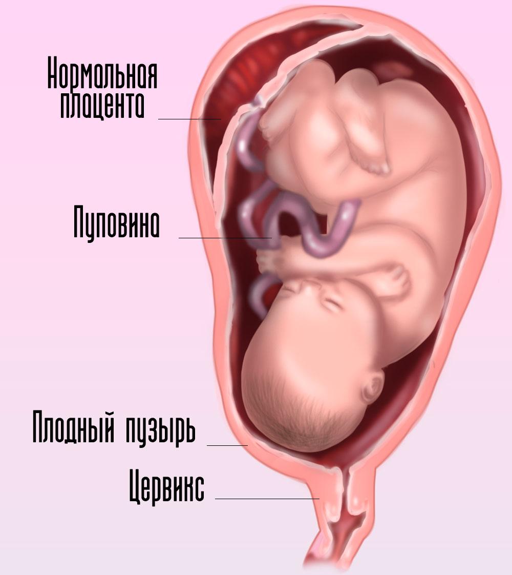 На рисунке изображен доношенный малыш, но еще не начался подготовительный период, и здесь видно, что цервикс, шейка матки, длинная, и она «закрыта», то есть незрелая. Чем ближе роды, тем короче и мягче она будет становиться, понемногу начнет приоткрываться сначала наружный зев шейки матки, потом внутренний – это у первородящих, а у повторнородящих они открываются практически одновременно – поэтому роды у них протекают немного быстрее, чем в первый раз.