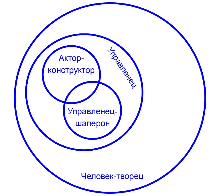 Управленцы-шапероны и акторы-конструкторы – это сетевым образом организованный клуб управленцев, которые прошли соответствующую подготовку по управлению развитием сверхкомплексных систем, сетей, иерархических структур, сред и других типов организованностей. Актор-конструктор может выступить в роли управленца-шаперона (то есть управляющего, который корректирует траекторию движения в будущее), в то же время управленец-шаперон может принимать решения как актор-конструктор, устремлённый в согласованное будущее. Управленец-шаперон и актор-конструктор – это как бы разные аспекты человека-творца, способного управлять развитием сверхкомплексных организованностей. Управленец-шаперон – это статус, подтверждающий управленческую квалификацию, а актор-конструктор – это жизненная позиция, появляющаяся в результате личного самоопределения. Изобразив объёмы этих понятий с помощью кругов Эйлера, можно получить следующую схему: