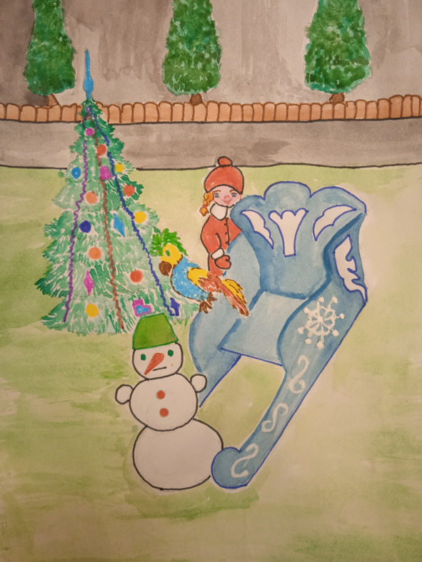 Ёлка была украшена мишурой и различными пластмассовыми игрушками. Здесь были шары, машинки, Дед Мороз и Снегурочка, шишки и многое-многое другое. Ёлка переливалась разноцветными огнями, соединяясь с белыми огнями, которые обрамляли сделанного из пенопласта метрового снеговика, стоявшего рядом с резными синими санями, разрисованными белыми причудливыми снежными узорами. Сани тоже сверкали золотыми мигающими гирляндами.