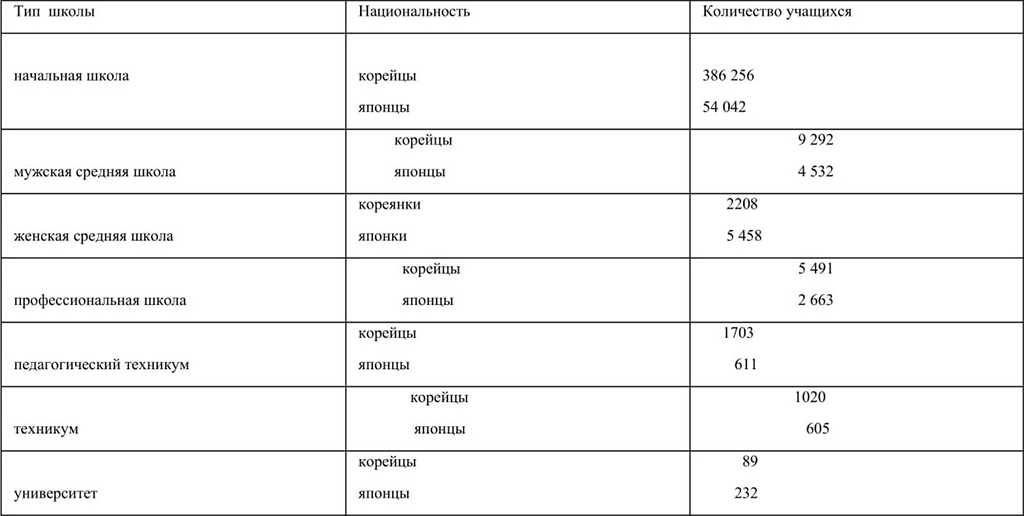 В феврале 1922 г. японская администрация издала приказ об образовании в Корее. Но провозглашенные равные права корейцев и японцев на образование, на самом деле, подразумевали всеобщее переобучение корейских детей японскому языку в школах по подготовке профессиональных рабочих, которых остро не хватало в аграрной стране. Сравнительно небольшое число государственных школ, открытых японцами, по их собственному признанию, преследовали цель «не столько давать знание корейским детям, сколько воспитывать в них любовь и уважение к японской нации». Это «уважение» и вдалбливали учащимся японские учителя, являвшиеся на уроки «в форме, с саблей на боку»[94].