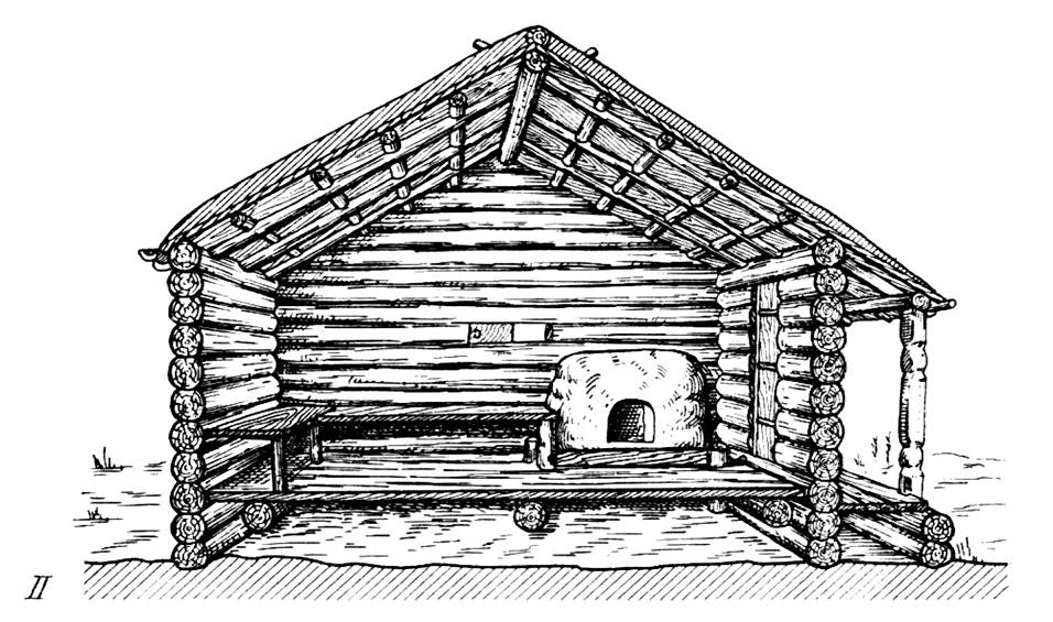 К XII веку практически на всей территории Древней Руси как в полуземлянках, так и в наземных жилищах утвердилась круглая глинобитная печь. При этом она все еще оставалась беструбной. Позже за ней закрепится название «курная»: дым шел прямо в избу42. По этой причине в домах отсутствовал потолок: над жилым помещением имелась только крыша, под которую и уходил дым. Чтобы его выпустить, открывали дверь и волоковое оконце, обычно находившееся на фронтоне избы. «Не терпевши дымной горечи, тепла не видать»43, – эти слова Даниила Заточника (XIII век) точно передают ту атмосферу.
