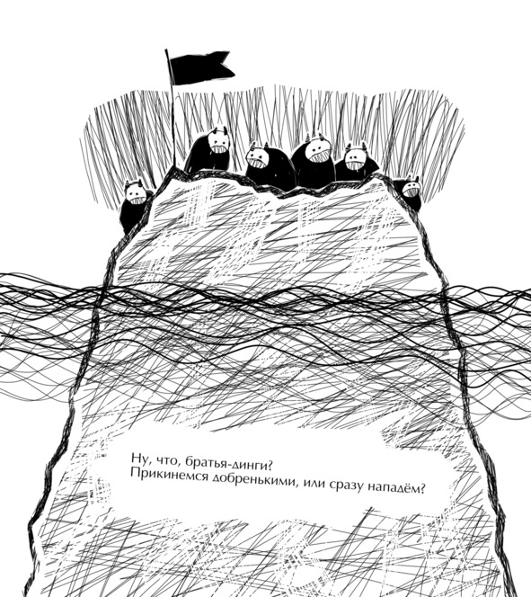 Но однажды, тоже очень давно, случилось страшное. По морю-океану, посреди которого стоял остров, на котором была страна Котовальня, плыл огромный преогромный айсберг. На этом айсберге жили-плыли злючие неистребимые ДИНГИ. Надо сказать, что ДИНГИ – это пострашней, чем какие-нибудь каразубы с мямликами или, там, гандапасы.