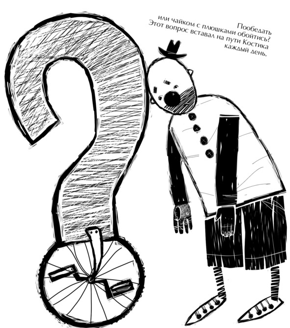 ОДНАЖДЫ у Костика закончилось его любимое абрикосовое варенье. А времени ОДНАЖДЫ было как раз через полчаса чай пить. А какой же чай без абрикосового варенья? Никакой. Такой чай даже страусы клевать не станут. Вобщем, дела у Костика были неважнецкие, поэтому он быстренько засобирался в гости. Костику всегда и все были рады, ведь он такой весёлый, дружелюбный и фантазёрный. Зная об этом, клоун номер один в мире вышел на крылечко своего крышедомика и сам с собой начал беседовать. Ну, так, придуряться начал: