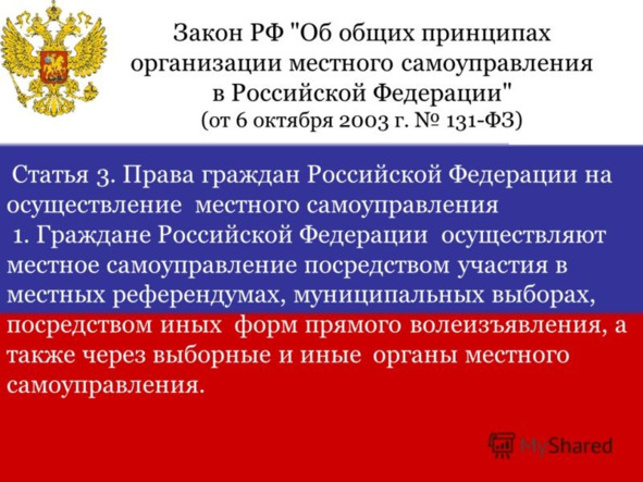 Процесс для России во многом новый, сложный и противоречивый. Как известно, согласно Конституции Российской Федерации 1993 г., местное самоуправление – это право граждан участвовать в управлении государством. Именно в управлении. Однако на протяжении многих лет это право дальше деклараций не распространяется. Свыше 100 законов и других нормативно правовых актов по данному вопросу вышло в России с 1990 г. по настоящее время. Но пока сдвигов крайне мало.