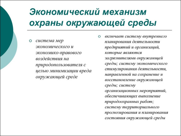 Объединенные глобальной природоохранной целью, данные средства могут иметь различное организационное, экономическое, идеологическое содержание. Отдельные элементы каждого из этих содержательных блоков, в свою очередь, являются относительно автономными и, соответственно, можно говорить, например, о механизме торговли квотами на выбросы парниковых газов, экологического контроля или стимулирования осуществления природоохранной деятельности и др. Все они направлены на охрану окружающей среды, хотя их цели являются предметными и более конкретными.
