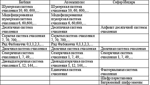 В таблице 8 приведены данные о системах счисления, выявленных в Библии, Апокалипсисе и Сефер Йецире.