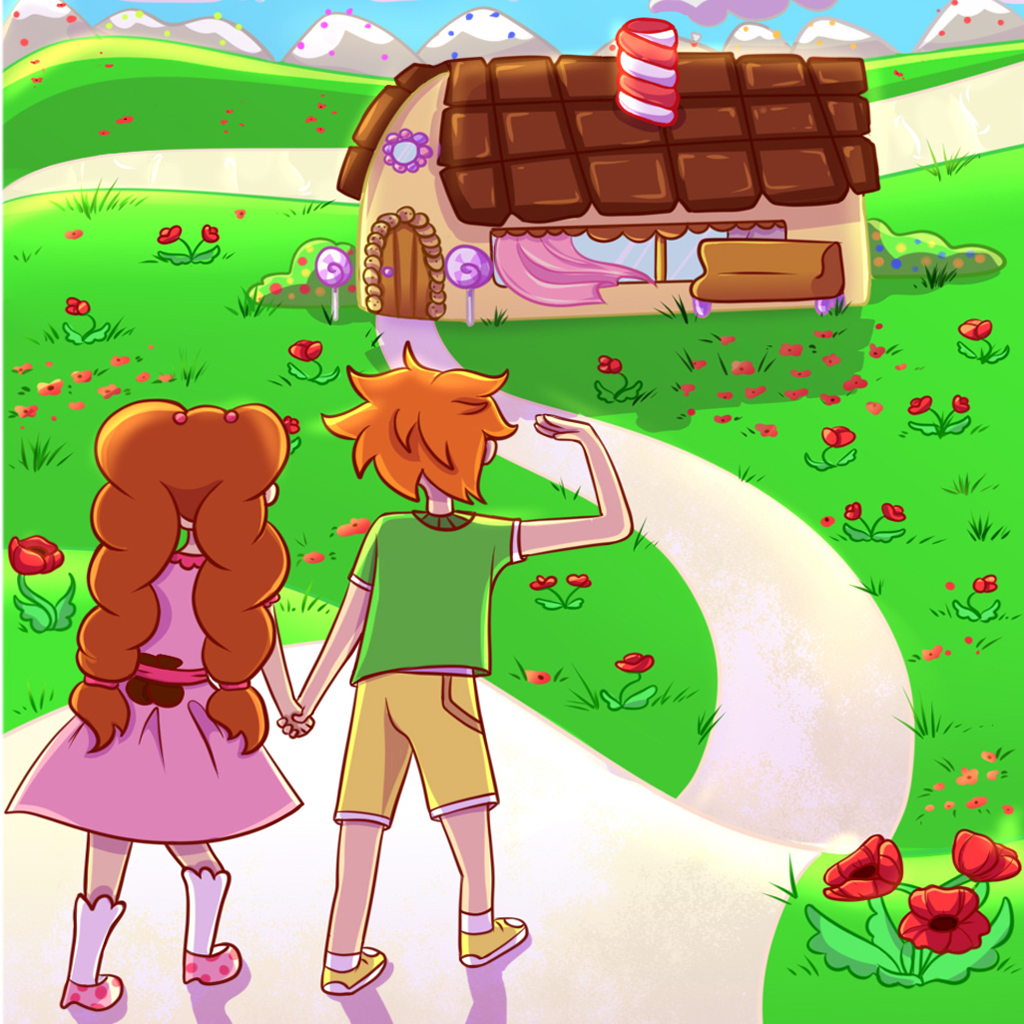Друзья шли вдоль горы, под ногами хрустели камешки-леденцы. В воздухе приятно пахло халвой. Обойдя очередной выступ горы, они увидели красивейшую картину. Перед ними простирался луг с нежной зеленой травой и красными маками. По центру луга стоял пряничный домик, к нему вела белая тропинка из сахарной пудры. Резные ставни обрамляли маленькие оконца. Одно окно было открыто и белые ажурные занавески колыхались на ветру. За домом журчала Молочная река.