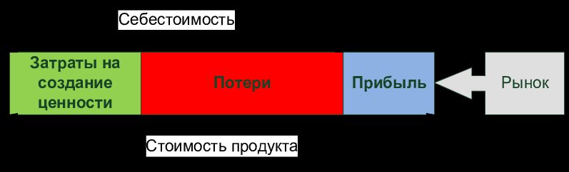 В lean нас интересует как раз себестоимость, то есть издержки, которые несёт организация при изготовлении определённого продукта или оказании услуги, т.е. те средства, которые необходимы для поддержания производства продукции и нормального существования организации. Это затраты на сырьё и материалы, заработанную плату работников, электроэнергию и прочие ресурсы. Говоря привычным языком, себестоимость состоит из издержек на создание ценности для Заказчика и бесполезных издержек, т.е. потерь.