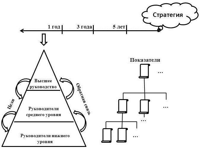 Большинство организаций имеют несколько подразделений: заводов, представительств и т.п., поэтому достижение краткосрочных целей должно быть распределено между ними и далее внутри них по уровням управления (см. Рисунок). На нем отображены ТОР-менеджеры как высший уровень управления (например, директора заводов, представительств), средний уровень управления (например, начальники цехов, отделов или производств) и низший (оперативный) уровень управления (мастера, руководители групп).