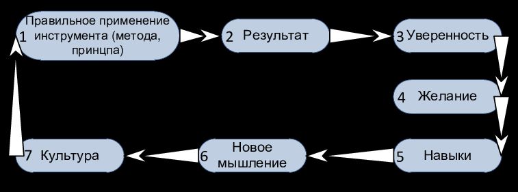 Остановимся подробнее на механизме формирования культуры. Правильное применение инструмента (выполнение всех шагов и соблюдение правил) непременно позволит достигнуть нужного результата, что придаст уверенности как руководителю, так и команде, что очень важно. Успех в любой сфере деятельности автоматически создаёт желание его повторить, в нашем случае – это применить инструмент или метод и получить нужный результат. Этот момент можно считать началом вырабатывания новых привычек.