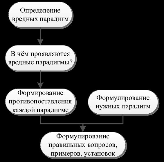 После того, как положительные парадигмы сформулированы, последним и самым важным шагом является формулирование правильных вопросов, примеров и установок, необходимых для формирования тех или иных парадигм.