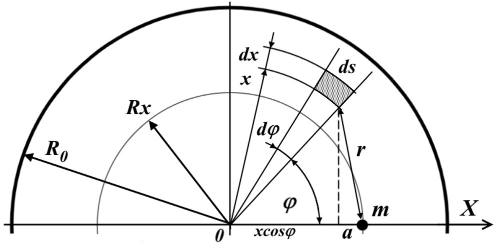 Далее мы рассмотрим гипотетическую структуру, некое условное подобие галактики: тонкий, с нулевой толщиной пылеобразный диск радиуса R0, внутри которого находится точечное тело массой m. Никакой привязки к реальной галактике мы не делаем. Под пылеобразностью диска подразумевается возможность для тел, находящихся внутри него, беспрепятственно двигаться независимо от других его компонент.