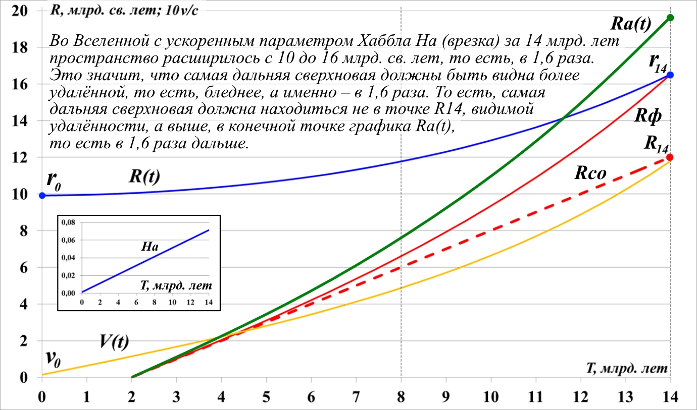 Обратимся к рис.11.10, на котором представлен график ускоренного расширения. За 14 млрд. лет фрагмент пространства расширился с 10 до 16 млрд. св. лет, то есть, в 1,6 раза. Это значит, что самая дальняя сверхновая должны быть видна более удалённой, то есть, бледнее, а именно – в 1,6 раза. То есть, самая дальняя сверхновая на рисунке должна находиться не в конечной точке штрихового графика R14, а выше, в конечной точке графика Ra(t), то есть в 1,6 раза дальше.
