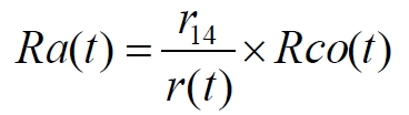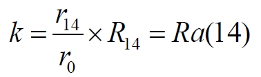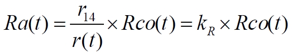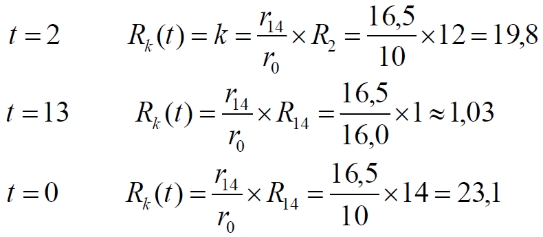 Здесь, r0(t) и r14 – удалённость от сверхновой в момент вспышки t и в момент наблюдения вспышки в наши дни, а R14 – кажущаяся наблюдаемая удалённость сверхновой, вспыхнувшей в момент t. По сути, этот коэффициент и является действительной удалённостью Rk(t) = Ra(t). Проверим по рисунку уравнения на осмысленность. Находим для дальней, ближайшей и самой дальней сверхновых: