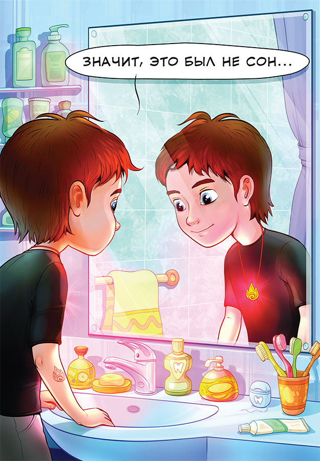 С кислым лицом Марк пошёл умываться. Но когда он мыл руки, то увидел шрам в форме кулона. И ещё он увидел в зеркале… Вы не поверите – его кулон светился красным светом, что случалось крайне редко. Вернее, только один раз – когда он родился и на него надели этот кулон. Красный свет означал силу.