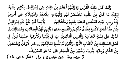 «Царство персов и его правители, без сомнения, обладали большей мощью, чем царство израильтян (Иудея), о чем свидетельствует победа Навуходоносора, который поглотил их страну, взял в свои руки власть и разрушил (Первый) Храм, центр их (евреев) религии и власти… Если бы число израильтян достигло этого числа (персов) или превысило его, их царство правило бы гораздо большей территорией, поскольку площадь и количество областей в каждом государстве находится в зависимости от большой или малой численности гарнизонов… и ведь царства сынов Израиля (Иудея и Израиль) охватывают только Иорданию, и Палестину в Аль-Шаме, и области Ятриб (Ясриб) и Хайбар в Хиджазе, как хорошо известно».[2]
