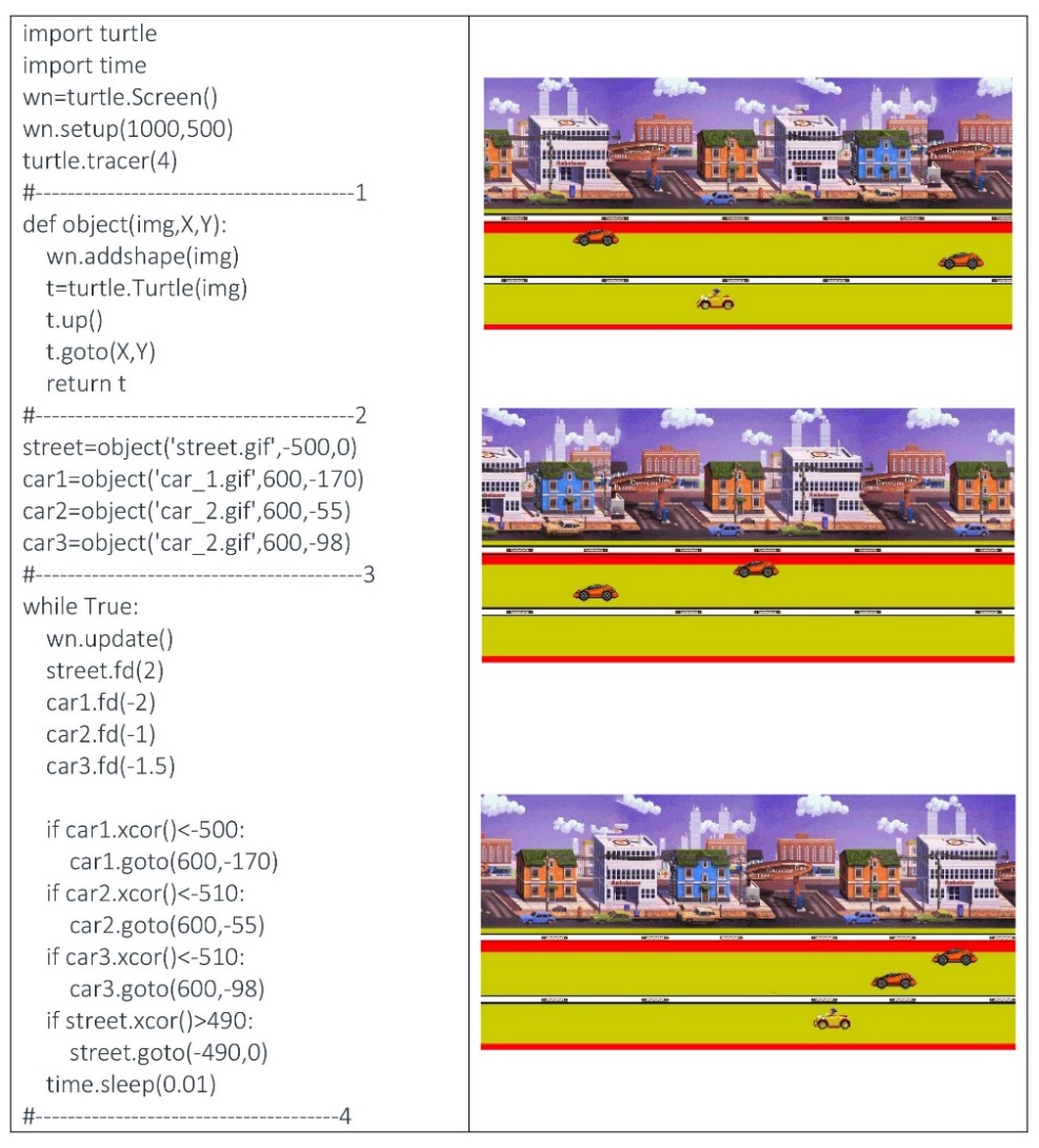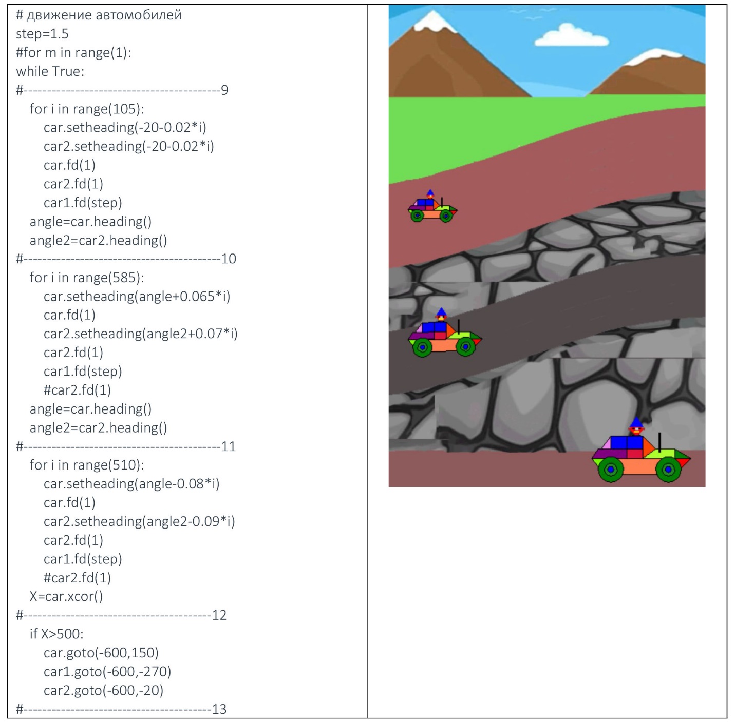 Если все блоки, начиная с линии 6 и ниже заменить на те, что представлены ниже в таблице 19, получим иной сценарий движения автомобиля (петля Нестерова или американские горки). В этом примере с помощью черепашьей графики программы Python создаем анимацию: движение автомобиля вдоль вертикальной петли. Сама петля с окружающим пейзажем введена в окно экрана файлом изображения, выбранным из интернета. Файл изображения окна следующий: Street9(4).gif. Этот файл можно скачать по адресу: