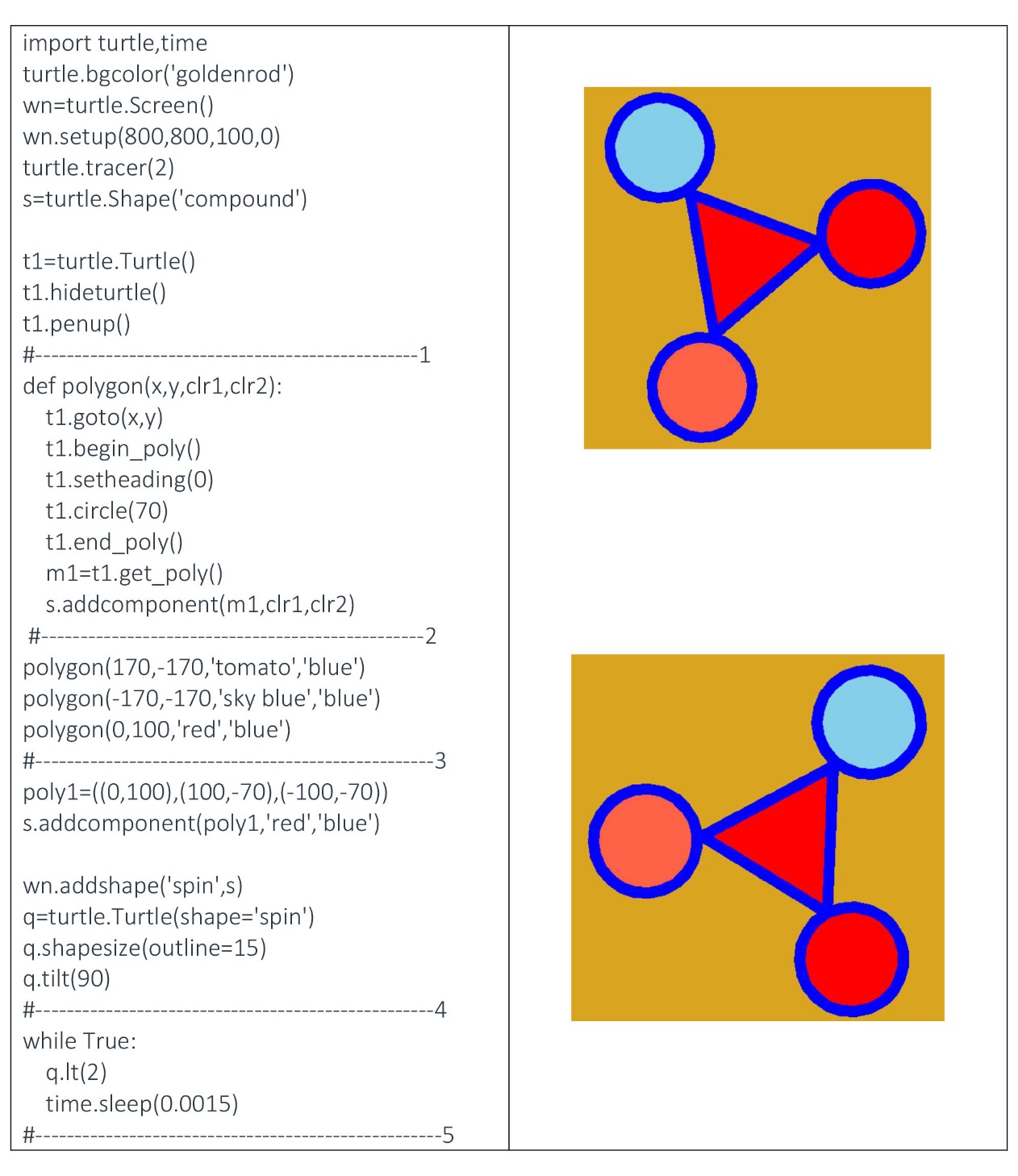 Коды между линиями 3 и 4, а также между линиями 4 и 5 определяют (с использованием библиотеки черепашьей графики) необходимые обьекты, которые затем используются в программе;