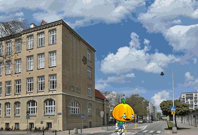 На первом этапе научимся передвигать единичный спрайт-изображение в заданном направлении. В качестве спрайт-изображения выберем тыквенного человечка, назовем его памкин (на английском pumpkin-тыква) . В качестве фона , на котором будет двигаться памкин, выберем пешеходный переход. Во-первых, нам надо найти и запомнить изображения памкина и фона в виде файлов в компьютере. Следует учесть, что все файлы изображений, которые используются в кодах библиотеки turtle должны иметь расширение gif. Обычно размер спрайт-изображения по горизонтали и вертикали не превышает 100-200 пикселей. Изображения фона, заполняющего экран, имеет размеры примерно 800-1200 пикселей по горизонтали и не более 750 пикселей по вертикали. Предположим, мы нашли нужное нам спрайт-изображение памкина, изображение фона и запомнили их в нужном формате(gif) в компьютере. Теперь, используя коды библиотеки turtle, создаем программу (скрипт) которая передвигает памкина вдоль горизонта на фоне изображения-улицы.