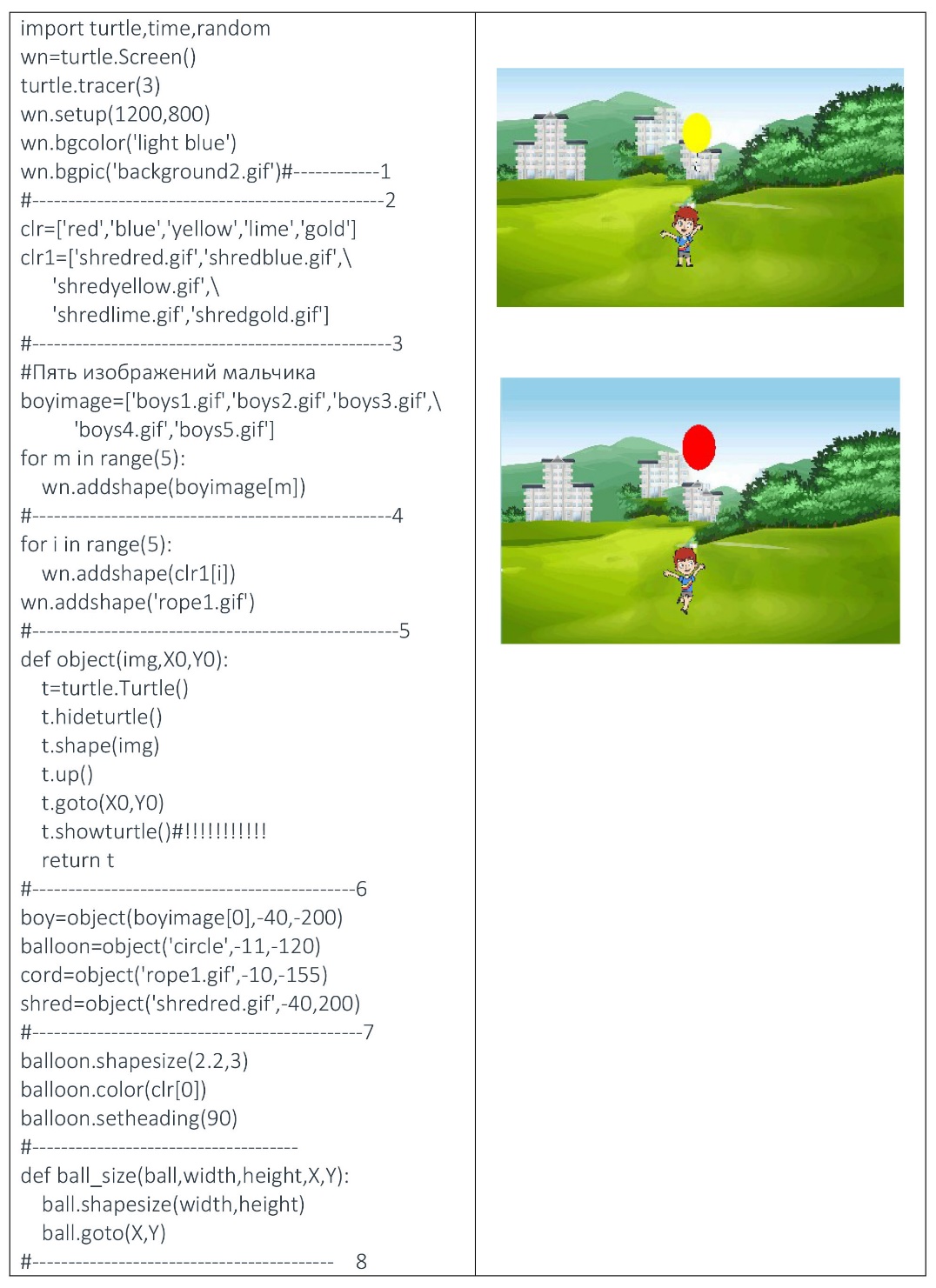 Поясним основные ключевые блоки программы. Картинка на экране, на фоне которой мальчик запускает вверх шарик, определяется файлом строки с номером 1. Между строками 2 и 3 расположены коды, задающие списки с цветами шариков а также изображения лоскутов лопнувших шариков. Между линиями 3 и 4 расположены коды, определяющие, танцующего мальчика. Коды между линиями 4 и 5 вводят в программу 5 лоскутов лопнувших шариков и изображение нитки, на которой држится шарик. Очень важными являются коды между линиями 5 и 6. Эти коды служат для определения функции, которая вводит следующие обьекты: мальчик, шарик, лоскуты лопнувшего шарика и нить, на которой держится шарик. Все 5 обьектов заданы кодами между линиями 6 и 7. Наконец, коды между линиями 8 и 9 определяют движение шарика вверх а также анимацию движений мальчика с помощью соответствующих спрайтов. Файлы изображений можно скачать поадресу: