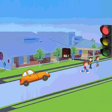 В демонстрируемом проекте участвуют несколько обьектов: три пешехода (каждый пешеход имеет 6 спрайт-изображений, отличающихся положением ног, для имитации движения); автомобиль(один спрайт); светофор с тремя спрайтами для создания переключающегося света (красный, желтый и зеленый); знак, обозначающий для пешехода необходимость переходить улицу либо стоять, когда автомобиль движется по улице (два спрайта).