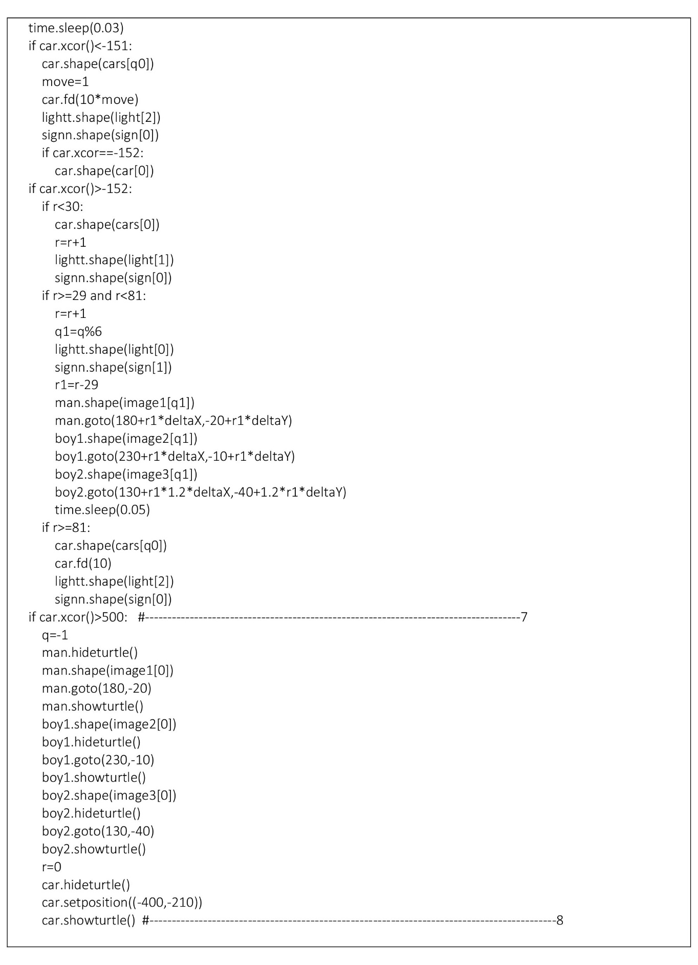 Коды между линиями 6 и 7 задают цикл, с помощью которого осуществляется движение автомобиля, переключение светофора, движение пешеходов, а также переключение знака, разрешающего пешеходам двигаться. Все движения обьектов подчиняются логике правильного движения на пешеходном перекрестке. Коды между линиями 7 и 8 задают логику повтора движения пешеходов при условии, что они(пешеходы) уходят за правый край экрана. При этом сценарий анимации движения повторяется.