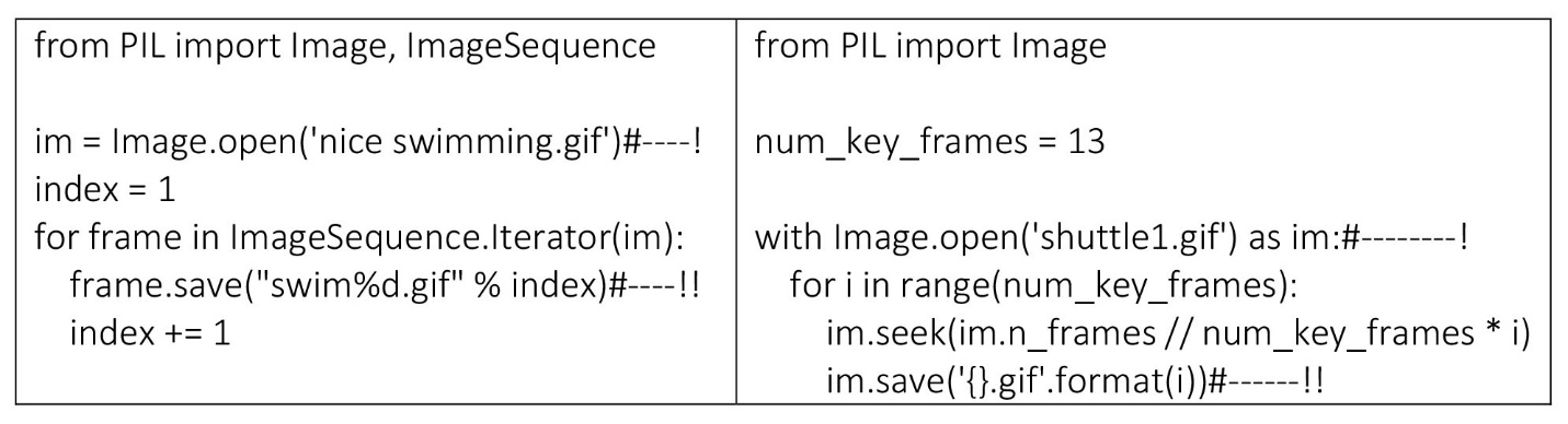 В примерах, которые показаны ниже, используется большое количество спрайтов изображений. Все статические спрайты получены из анимационных файлов с расширением gif. Каждый такой файл может содержать десятки а иногда и сотни статических кадров, и конечно вводить в программу каждый статический файл крайне неудобно. Для ускорения ввода таких файлов в программу Python можно воспользоваться специальной программой, преобразующей gif анимационный файл в набор статических перенумерованных в определенном порядке файлов, каждый из которых имеет такое же расширение gif , пригодное для использования в основной программе. Две возможные программы для ковертирования анимационного изображения в набор статических файлов показаны в таблице 30. Для того, чтобы воспользоваться показанными программами необходимо проинсталировать на компьютер в среду Python библиотеку PIL, которая имеется в свободном интернете. С левой стороны показана программа, в которой не нужно задавать количество кадров gif файла, с правой стороны – программа, в которой необходимо задать количество кадров пробразуемого файла. Т.е., в первом случае количество кадров-изображений(frames) определяется исходным файлом, во втором случае этим количеством можно варьировать. Как в левой так и в правой программе строка с пометкой ! задает исходный анимационный файл с расширением gif, строки с пометкой !! определяют статические gif файлы.