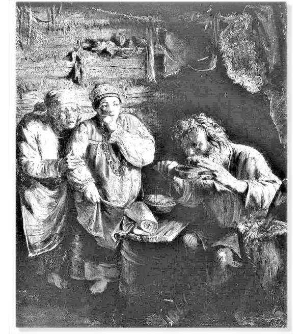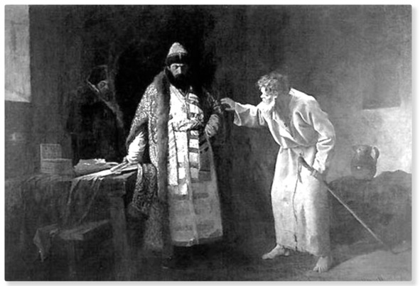 Царь Иоанн Грозный в келье юродивого Николая Салоса в Пскове. Худ. И.А.Пелевин 1877 год. Государственный художественный музей (Ханты-Мансийск).