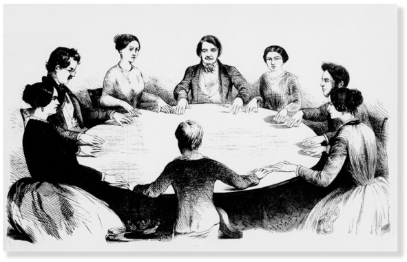 Первое выступление Дэниэла Юма в петергофской резиденции императорской семьи произошло 8 июля 1858 года на вечернем собрании у государя Александра II. Представители императорской фамилии59 и гости60 сидели за круглым столом, положив на него руки. В комнате раздавались стуки, которыми «духи» отвечали на задаваемые вопросы. В какой-то момент стол приподнялся над полом, гости чувствовали прикосновение рук, и «духи» даже перенесли по воздуху колокольчик из рук императора принцу Вюртембергскому…61 Спиритический сеанс имел большой успех.