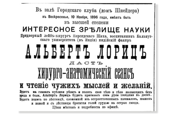 Вот как описывается в прессе выступление Придворного лейб-хирурга Персидского Шаха, воспитанника Калькутского университета (в Индии), индийского факира Альберта Лорица.