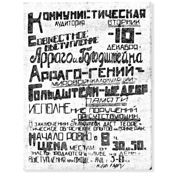 Агитка выступления в МГУ гения мировой калькуляции АРРАГО и шедевра памяти, исполнителя мысленных поручений зрителей ГОЛЬДШТЕЙНА. Начало 1920-х годов.