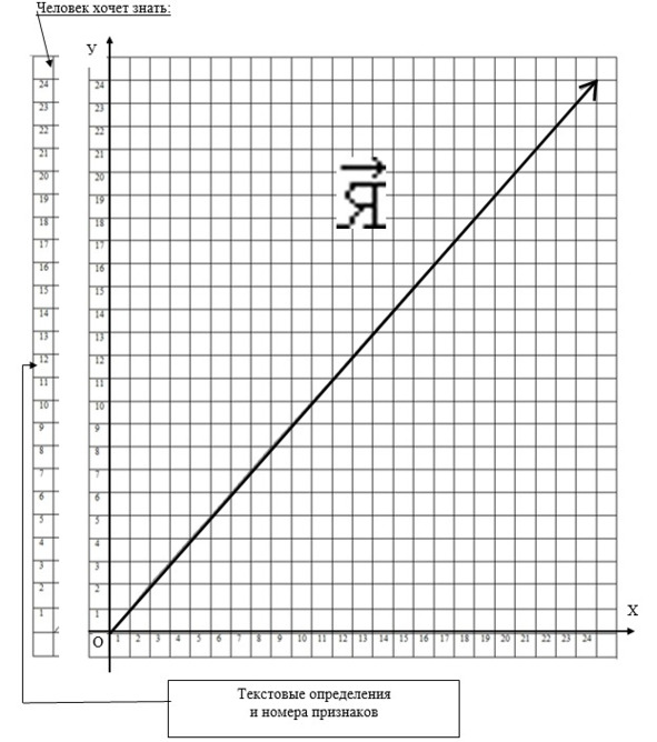 Для создания математической схемы на мышление человека проводим две взаимно перпендикулярные линии. На вертикальной и горизонтальной линиях откладываем по 24 отрезка равной длины. Вертикальную линию обозначим осью 0Y, горизонтальную 0X. Нумеруем эти 24 промежутка от точки пересечения перпендикулярных линий по возрастающей вверх на 0Y, на 0X направо. На 0Y в каждый промежуток между горизонтальными линиями вписываем перечни требований по существующему порядку обозначений в тексте СТ.