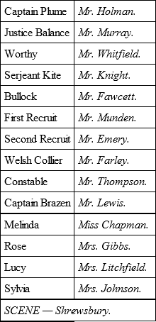 The author was himself a recruiting officer, and possibly gathered all the materials for this play on the very spot where he has placed his scene – Shrewsbury. He has dedicated the piece "to all friends round the Wrekin," and has thanked the inhabitants of the town for that cheerful hospitality, which made, he adds, "the recruiting service, to some men the greatest fatigue on earth, to me the greatest pleasure in the world."