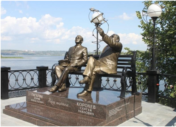 Памятник «Перед полётом», г. Энгельс, скульптор Мария Галина. Сергей Королёв и Юрий Гагарин не были в Энгельсе перед первым космическим полётом. Важно, что корабль первого космонавта приземлился на Саратовской земле, под Энгельсом – близ берега Волги (фото предоставлено автором материала)