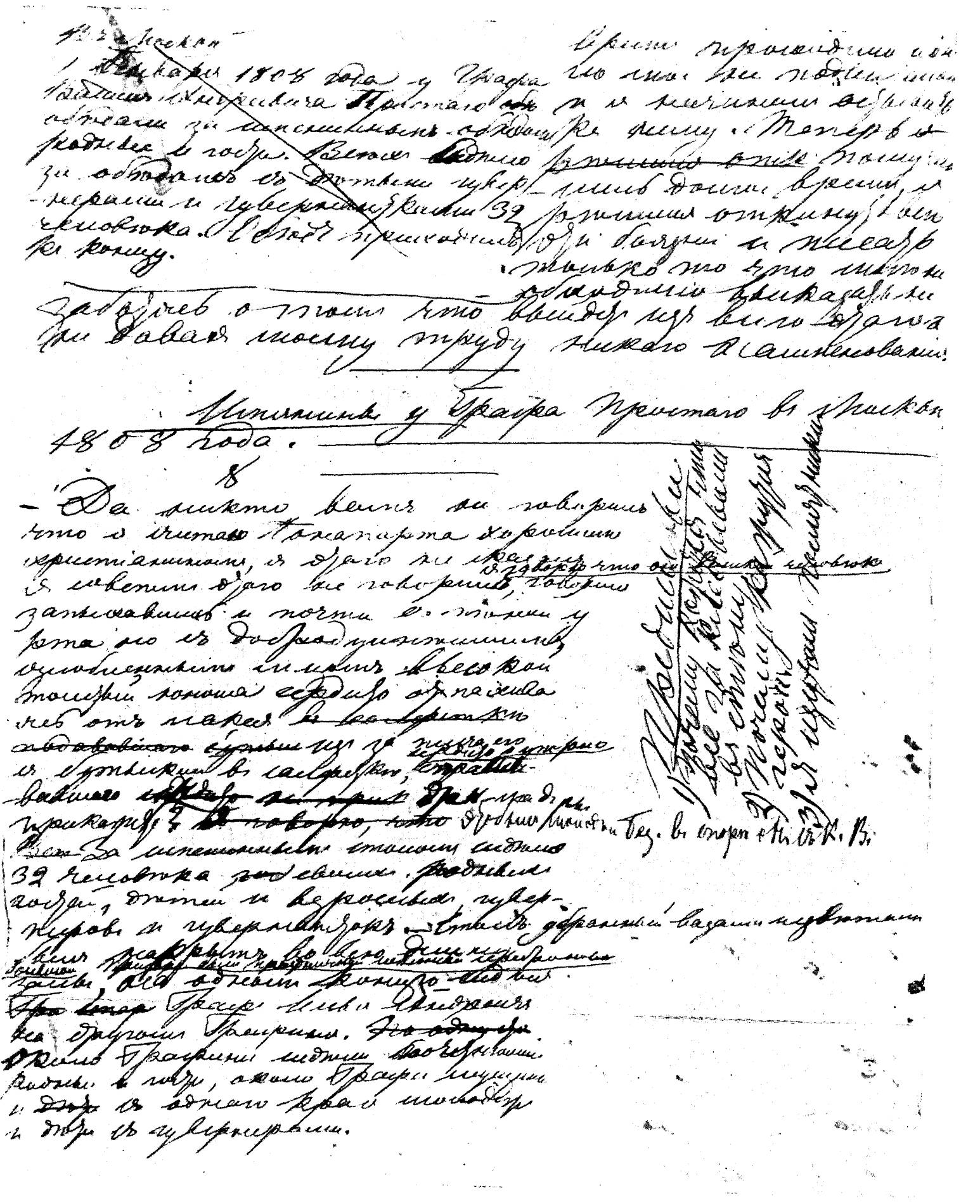 <[602] В Москве жило семейство В-ых с 1801 по 1825-й год, когда умерла мать и переженившиеся сыновья и повышедшие замуж дочери, кроме одной, оставшейся девицей, поразъехались и дом В-ых уничтожился. Отец их, умерший в 1796 году, был министром и имел двадцать пять тысяч душ. Тот, кто не знал В-ых в Москве, тот не знал хорошего московского общества. С 1805-го года старшая дочь Катишь В. сдружилась с княжной Мари Волконской. Мари жила в деревне с отцом <и в Петербурге, изредка в Mocквe>. Катишь жила в Москве и на даче. Между ними завязалась та женская высшего общества переписка, которая в то время считалась нравственной необходимостью для каждой хорошо воспитанной девушки и женщины. Переписка эта была – обычай, для них же она казалась душевной потребностью и влечением. Переписка была на французском языке <и для того, чтобы дать понятие читателю> я привожу одно письмо в подлиннике, остальные я буду переводить.