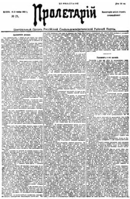 Первая страница большевистской газеты «Пролетарий» № 25, 16 (3) ноября 1905 г. с передовой статьей В. И. Ленина «Приближение развязки» (Уменьшено)