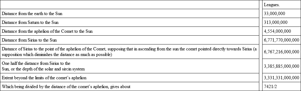 Sirius, the most brilliant fixed star, and which for that reason may be regarded as the nearest sun to our’s, affords to our sight only a second of annual parrallax on the whole diameter of the earth’s orbit, and is therefore at the distance of 6,771,770, millions of leagues distant from us, that is, 6,767,216 millions of leagues from the limits of the solar system, such as we have assigned it after the depth to which the comets immerse. Supposing then, there is an equal space from Sirius to that which belongs to our sun, we shall perceive that we must extend the limits of our solar system 742 times more than it is at present, as far as the aphelion of the comet, whose enormous distance from the sun is nevertheless only a unit on 742 of the total diameter of the solar system.