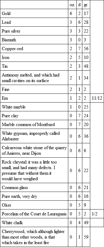 I must here observe, that a positive conclusion must not be made of the exact specific weight of each matter from the preceding table, for notwithstanding the precaution that was taken to render the globes equal, yet, as I was obliged to employ different workmen, some were too large, and others too small. Those which were more than an inch diameter were diminished, but those of rock chrystal, glass and porcelain, which were rather too small, we suffered to remain, and only rejected those of agate, jasper, and porphyry, which were sensibly so. This precision in size was however not absolutely necessary, for it could very little alter the result of my experiments.