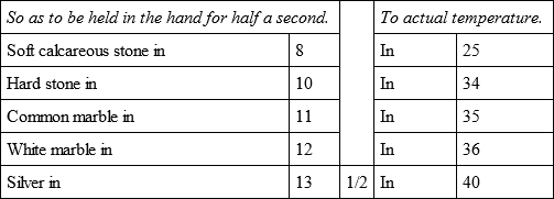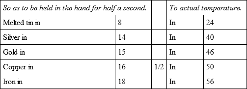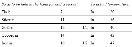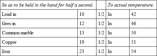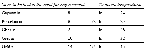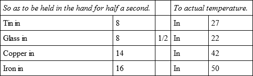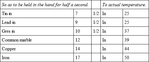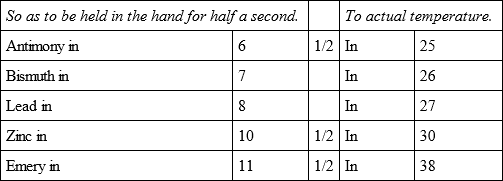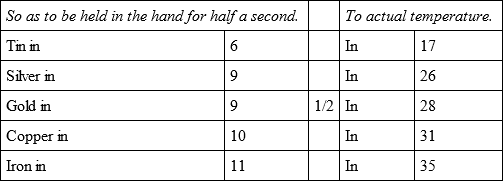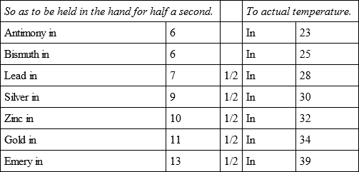 The whole of these experiments were made with the utmost care and attention, not only by myself but in the presence of several persons, who also endeavoured to judge of the first degree of temperature by holding the bullets for half a second in their hands, and the relations of which are more exact than those of the actual temperature, because that being variable the result must sometimes vary also.