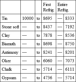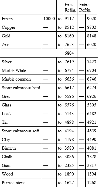II. By comparing those substances which we term semi-metals and metallic minerals, which want ductility, we shall perceive, that the order of their density is emery, zinc, antimony and bismuth, and that in which they receive and lose heat, is antimony, bismuth, zinc, and emery; and which does not in any measure follow the order of their density, but rather that of their fusibility. Emery, which is a ferruginous mineral, although as dense again as bismuth, retains heat longer. Zinc, which is lighter than antimony or bismuth, retains heat longer than either. Antimony and bismuth, receive and keep it nearly alike. There are, therefore, semi-metals, and metallic minerals, which, like metals, receive and lose heat nearly in the same relation as their fusibility, and partake very little of their density.