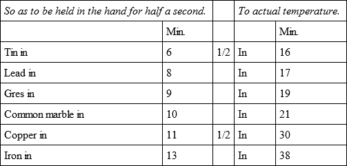 I have made similar experiments on globes of marble, stone, lead, and tin, by a heat only strong enough to melt tin, and I found, that iron refrigerated in eighteen minutes, so as to be able to hold it in the hand, marble refrigerated to the same degree in twelve minutes, stone in eleven, lead in nine, and tin in eight. It is not, therefore, in proportion to their density, as is commonly supposed, that bodies receive and lose more or less heat, but in an inverse ratio of their solidity; that is, of their greater or lesser non fluidity; so that, by the same heat, less time is requisite to heat or cool the most dense fluid.