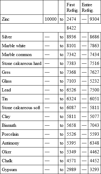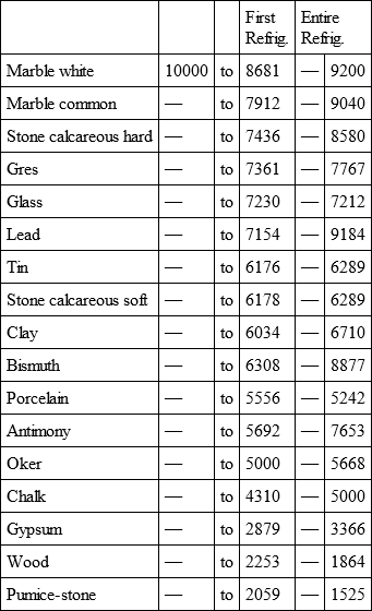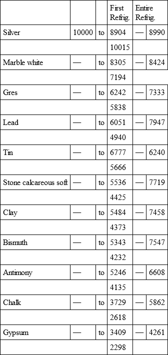 With a view to avoid that prolixity which would necessarily attend the continual repetition in a comparative statement of the refrigeration of these different bodies, we have connected them in a general table, and taking 10,000 for the standard of comparison, their differences may be seen at one view.